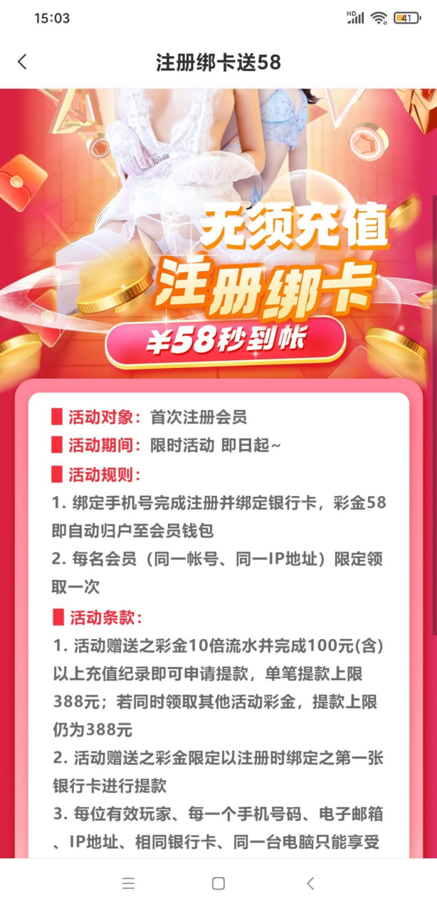亲,注册绑卡58彩金已在7/22 18:00下架,活动停止将无法派发