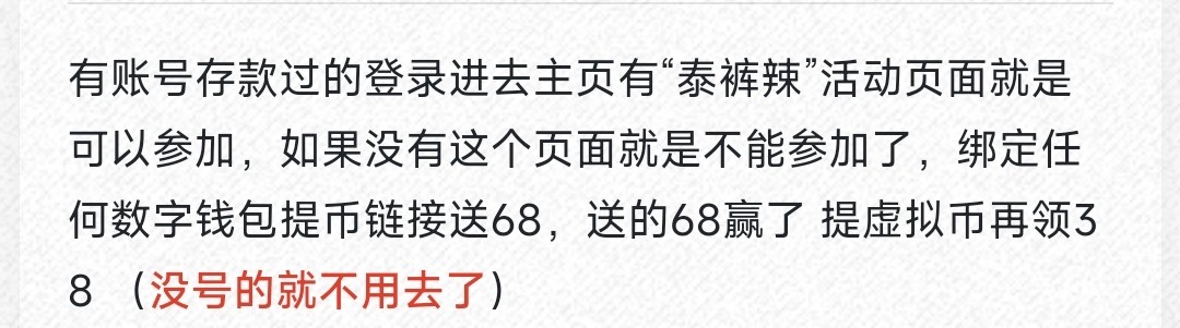 有账号存款过的登录进去主页有“泰裤辣”活动页面就是可以参加,如果没有这个页面就是不能参加了,绑定任何数字钱包提币链接送68,送的68赢了 提虚拟币再领38 (没号的就不用去了