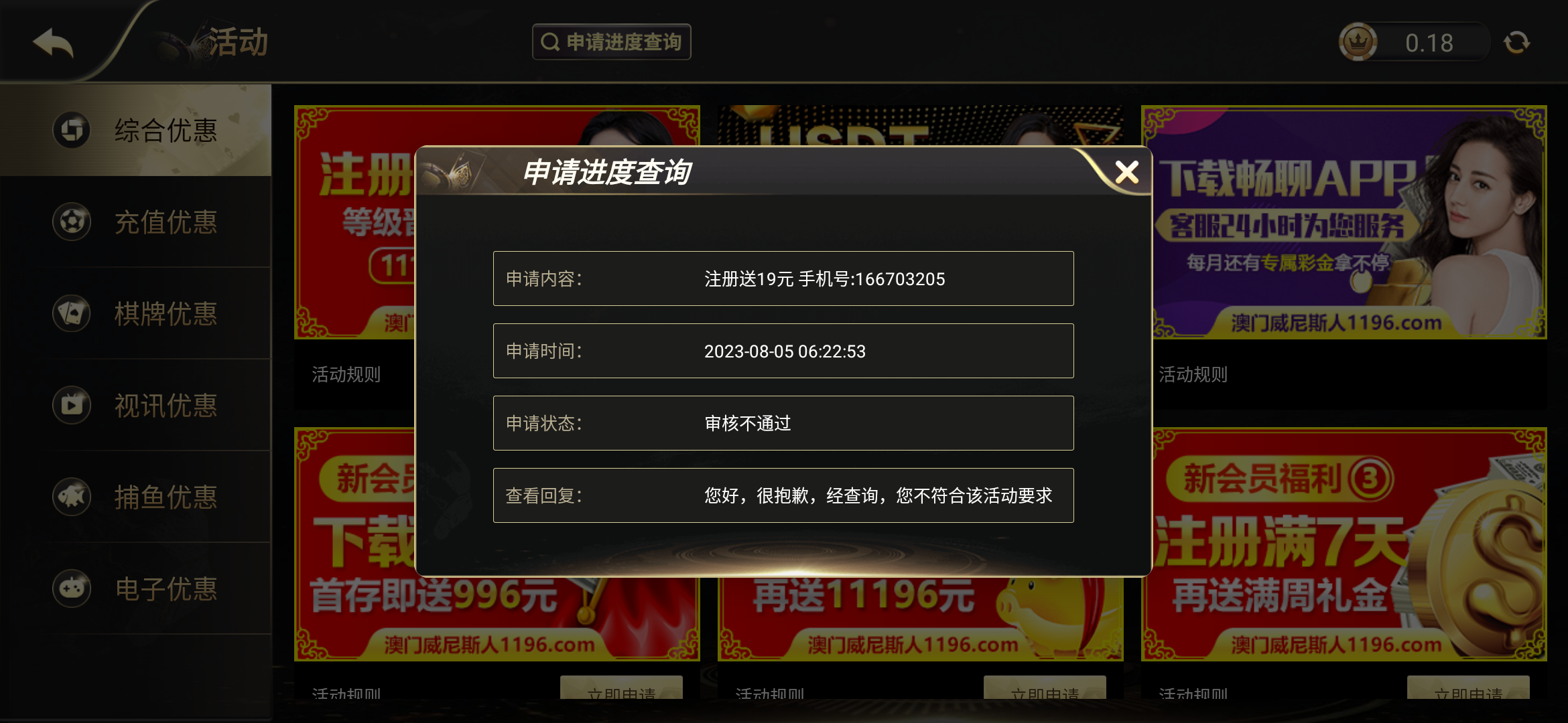 新用户下载APP注册自助申请送19彩金,要10倍流水提现,具体自测!