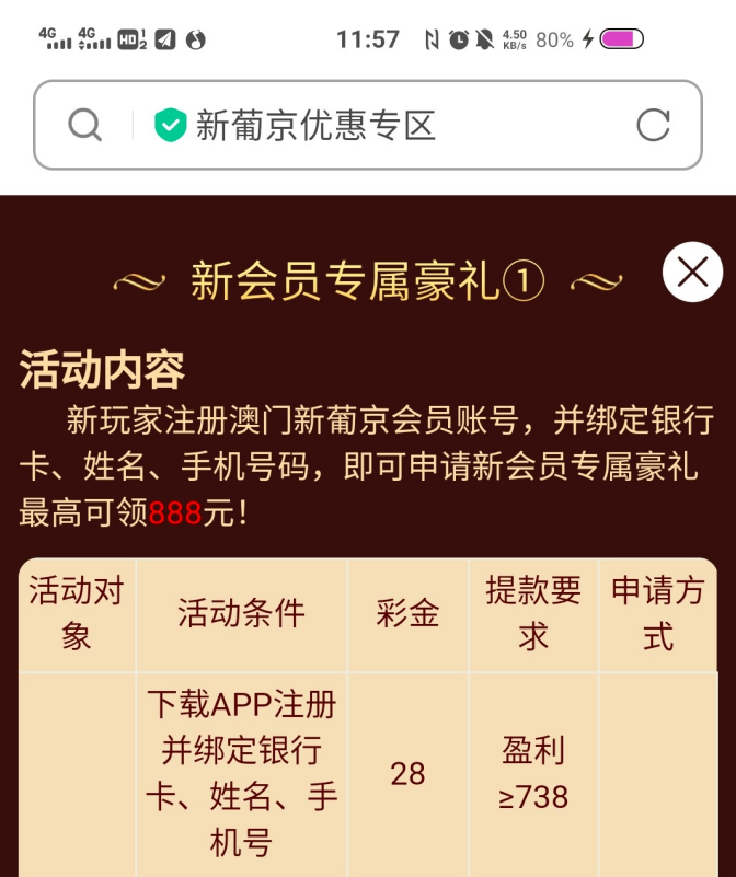新用户去注册绑卡申请28彩金 738下