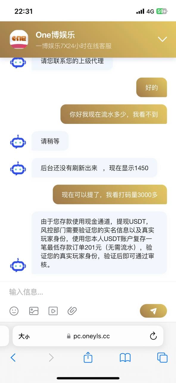 客服支付宝代存款,200+200,流水1800才能取款。取款500提u,让复存201元验证身份,然后存款进去就不能提了,客服也不回消息,网站 https://oneyls.cc
