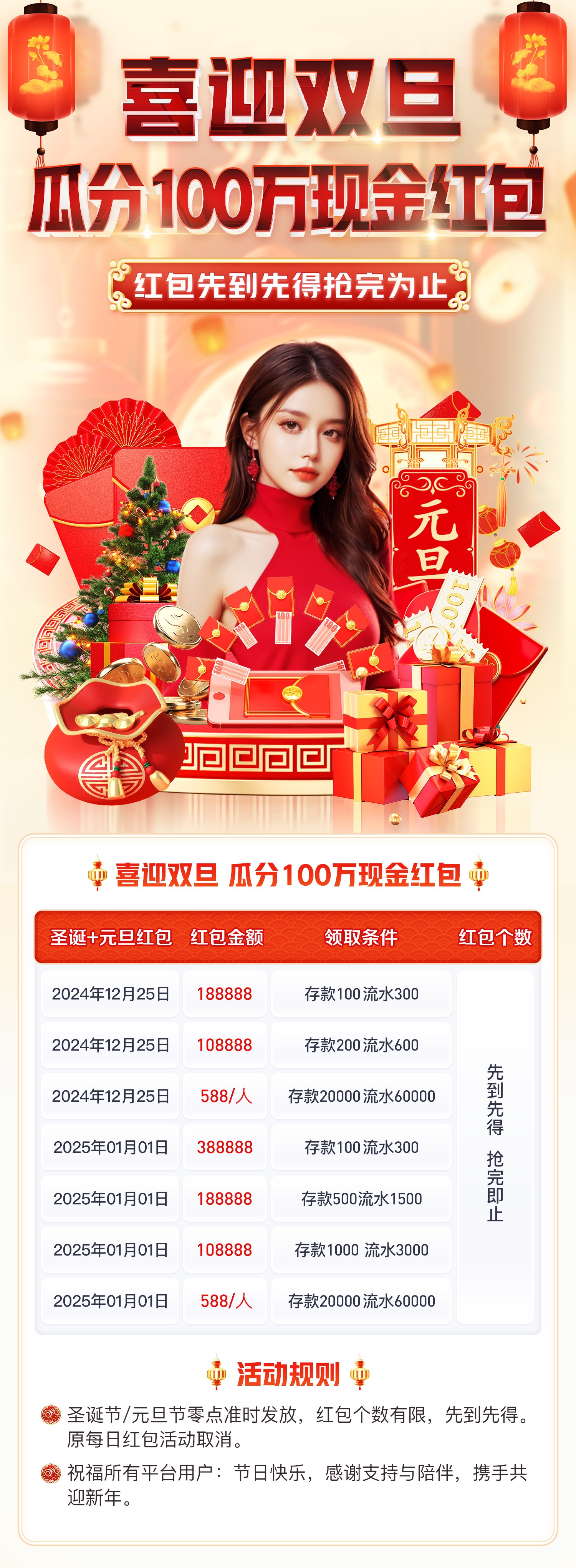 APP欢庆元旦,百万红包大奖、大舞台专属礼物!元旦节日(01月01日)0点开始瓜分 388888+188888+108888 现金红包,最高可领取588/人;两个平台活动都一样!