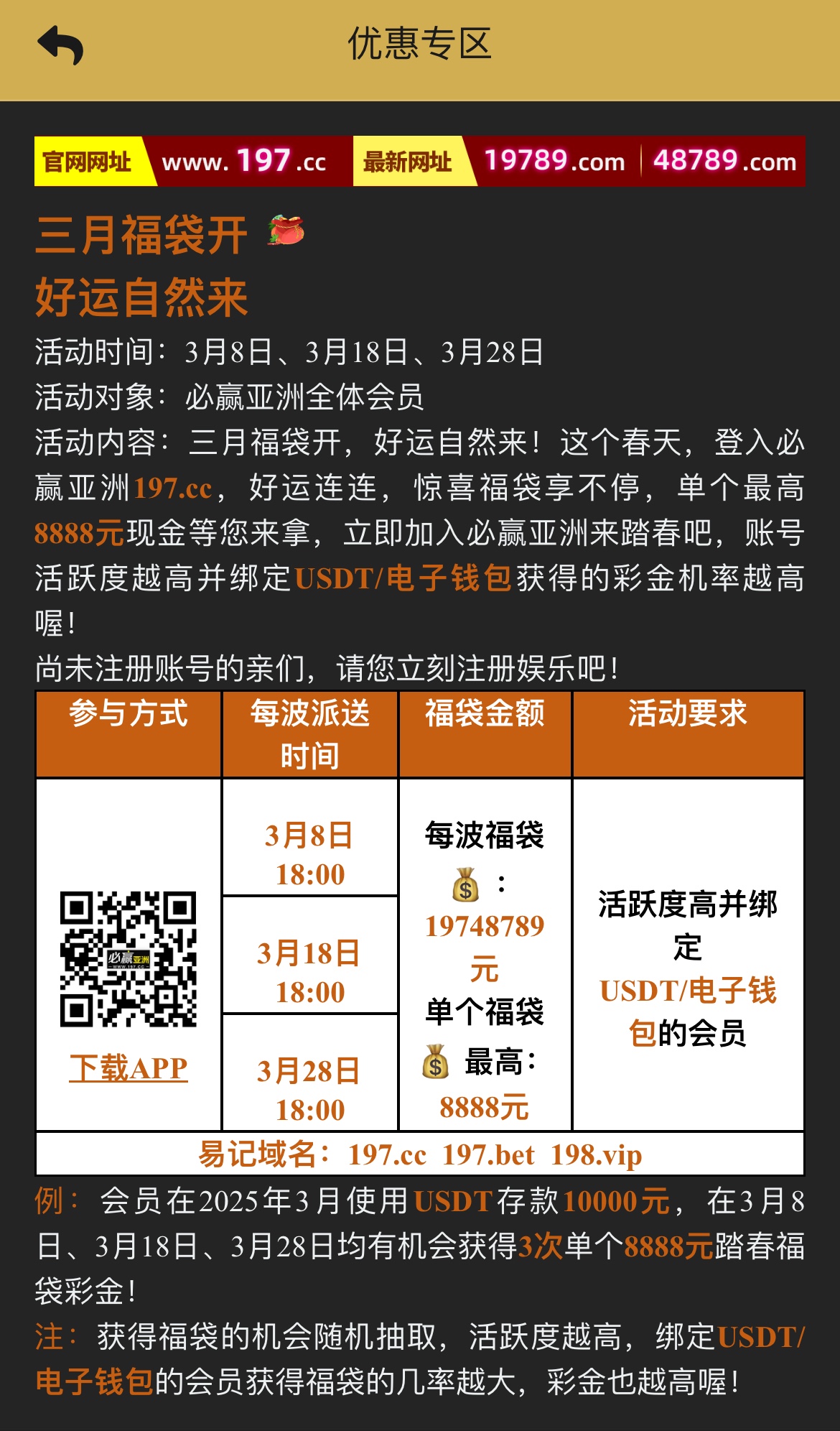 老用户活跃度高并绑定USTD/电子钱包的老哥可以去抢这个月的幸运福袋,3月8号/18号/28号晚上6点抢,要下载APP