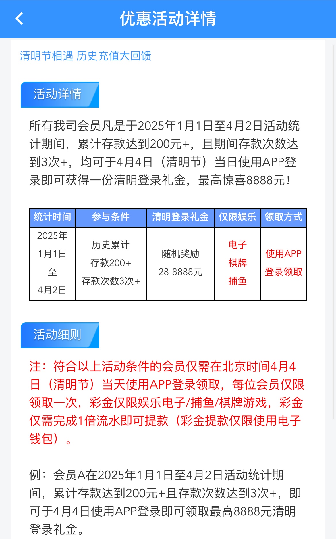 在今年1月1号-4月1号历史累计存款200+存款次数3+,在4月4号清明节当天登入APP领取回馈28,限电子棋牌捕鱼