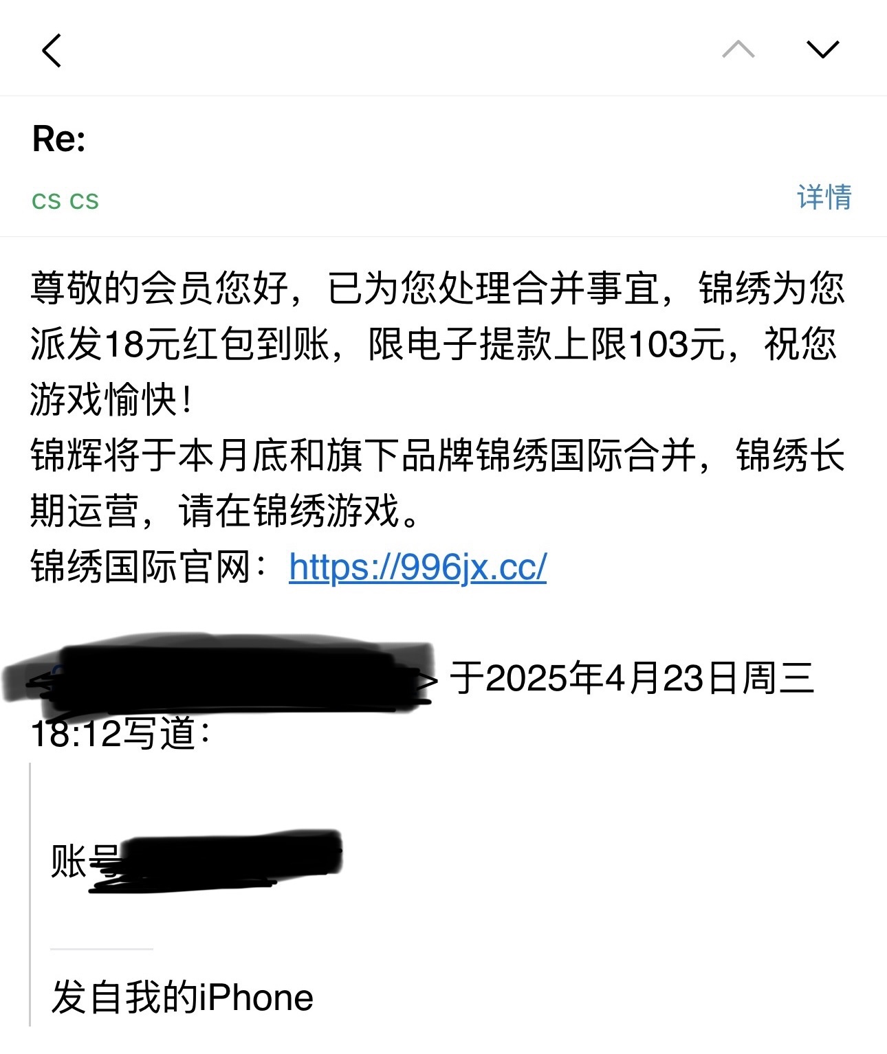 在锦辉娱乐注册有号的兄弟可以去锦绣国际申请合并彩金,可能只有充值过的才有可以去试试,彩金限制电子最高提103,可以先看看自己邮箱有没有收到特别是垃圾邮箱