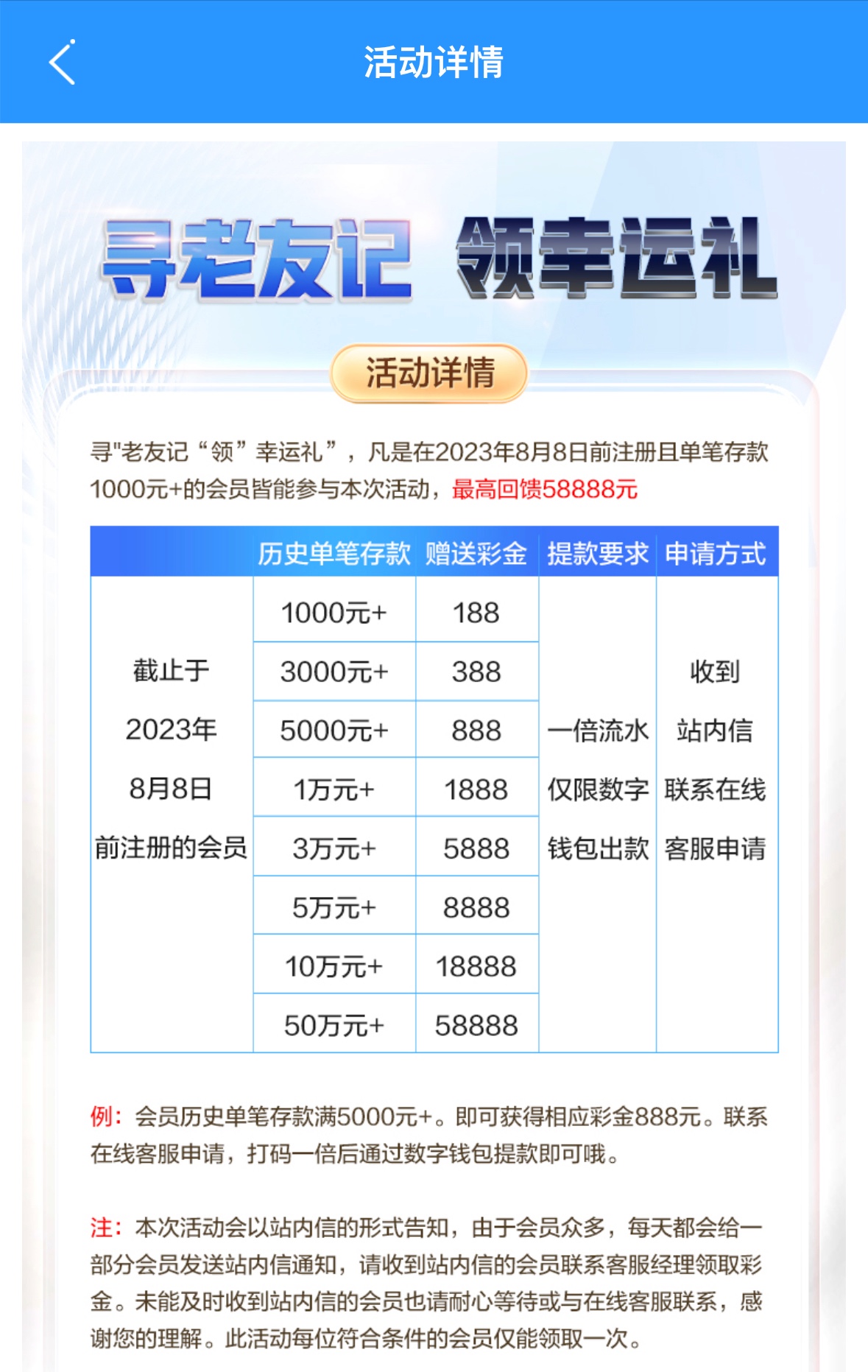 在2023年8月8号前注册过有历史存款的兄弟可以登入上去看有没有收到站内信,有的话联系在线客服申请彩金,一倍流水