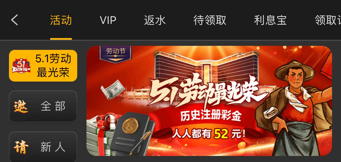 4月25号之前存款过1+的兄弟5.1下午5点登入APP那天上号有5.2的彩金限PG/LG/WG盈利到52才能提款,存款过50以上存款5次以上有52彩金三倍流水