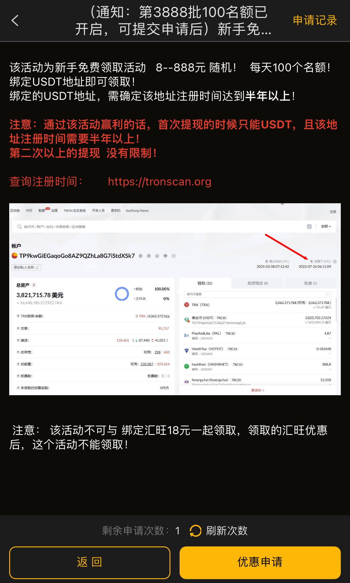 注册绑定半年活跃的USTD地址自助申请彩金每天只有100个名额,绑定汇旺要2u做为认证,认证完成会原路退回送18彩金,这两个活动只能选择一个参加